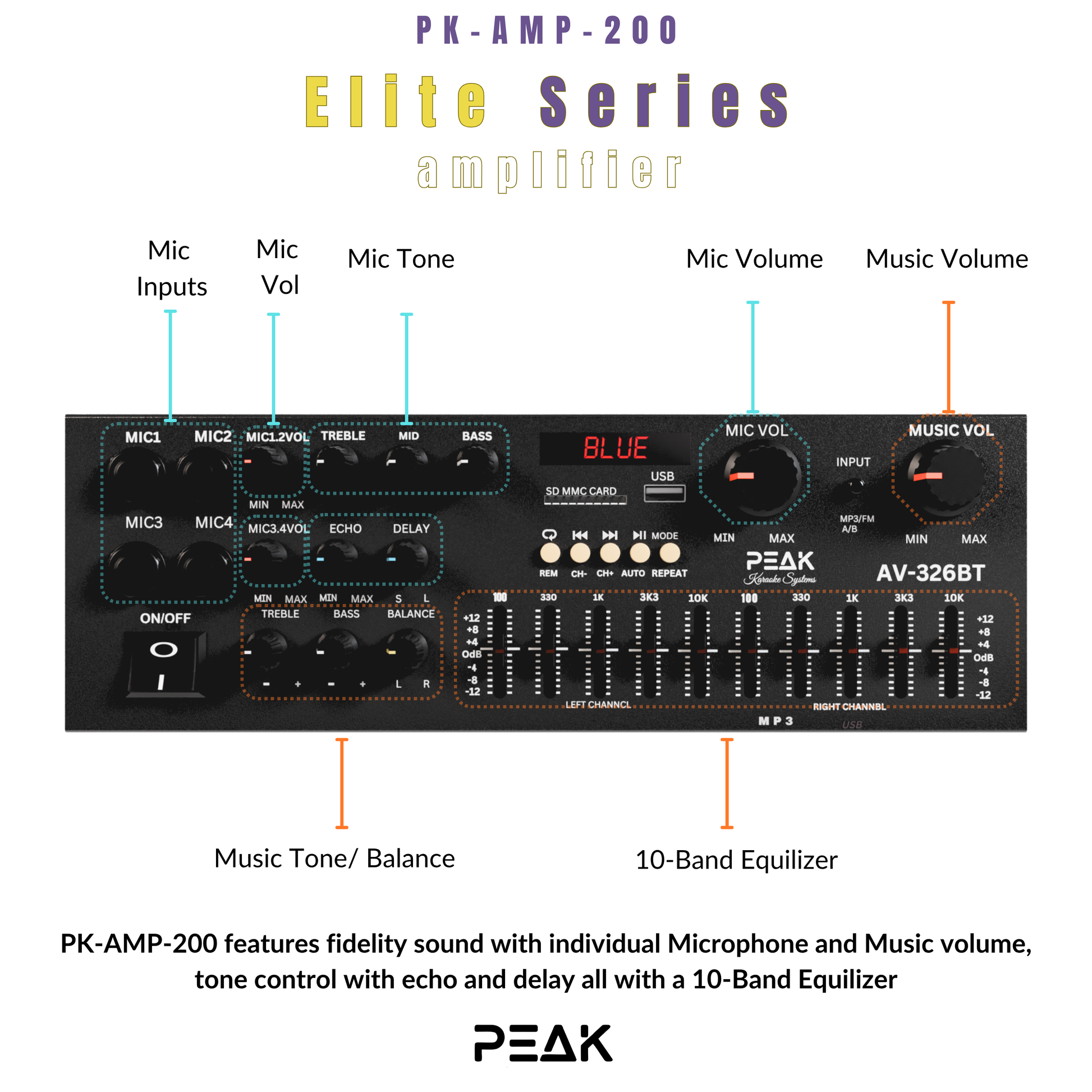 The PK-AMP-200 - 2000W Karaoke Amplifier/Mixer delivers studio-quality audio with depth and clarity. Fine-tune your sound with a 5-band EQ per channel, plus separate voice, music, echo, and delay controls for a flawless mix every time.