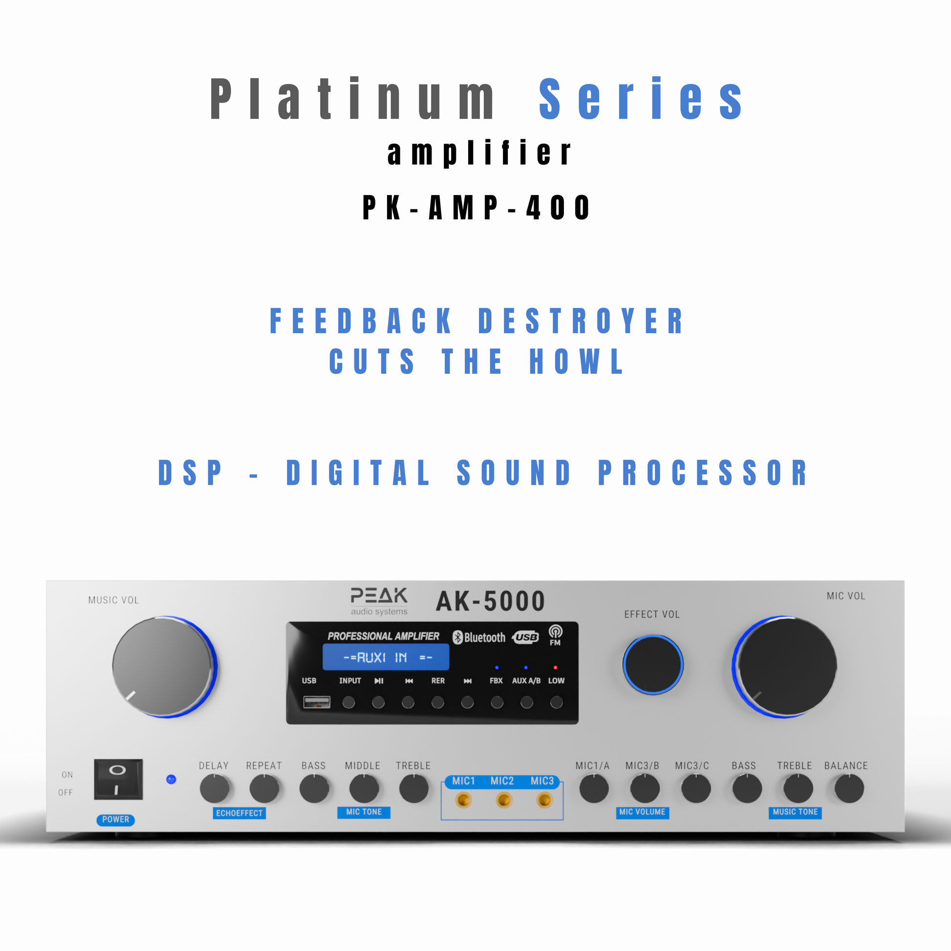 Elevate your sound with the powerhouse 4000 Watt Karaoke Amplifier/Mixer. With a peak output of 4000W, the PLATINUM amplifier delivers crystal-clear audio with exceptional clarity and depth, eliminating distortion for a studio-quality sound experience. The upgraded DSP (Digital Sound Processor) provides utmost clarity and stability for the music and the vocals to come through crystal clear. The AK5000 comes equipped with an advanced feedback destroyer that automatically detects and suppresses feedback frequencies using high-precision narrow notch filters (high-Q parametric EQ). It reacts faster than manual adjustments, ensuring clear, uninterrupted sound even in challenging environments.